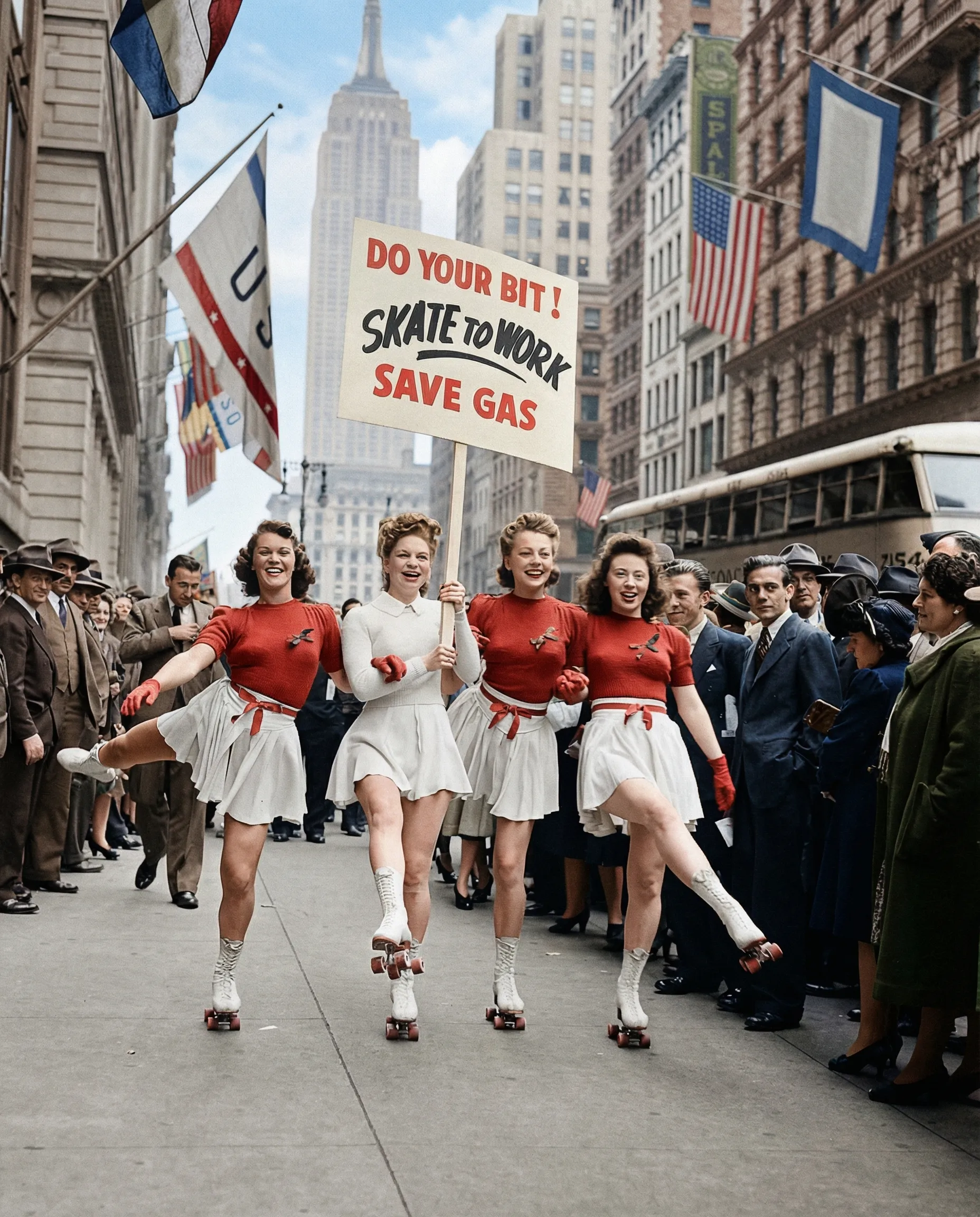 1940s NYC "Skate to Work" scene colorized with authentic period colors by Restory's era-accurate AI